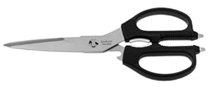 Made from high-carbon, cutlery-grade stainless steel, these well-made shears are great for a variety of uses--from cutting pizza to cleaning just-caught fish. They combine a straight edge with a serrated edge for maximum versatility. Plus, this handy kitchen tool’s bonus features are numerous. A lid lifter pries under rolled metal lids to raise them quickly and easily, while its unique handle design helps grip the lids of tough-to-open jars. Other highlights include a bottle opener, nutcracker, and bone notch for grabbing game or poultry bones. Blades un-hinge for easy clean-up, and are safe to clean in the dishwasher. Ideal for trimming meat, snipping herbs, or cutting flowers, these shears are as useful for the hunter, fisherman, or outdoors lover as they are for the home cook. --Mary Park
