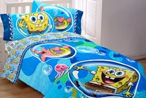 Join the fun as Sponge Bob and Patrick float around in big bubbles at the bottom of the sea. The fitted sheet has a white ground, flat sheet had a blue ground with a reversible pillowcase. Made of 100-Percent polyester microfiber for a soft hand. Machine wash and dry.