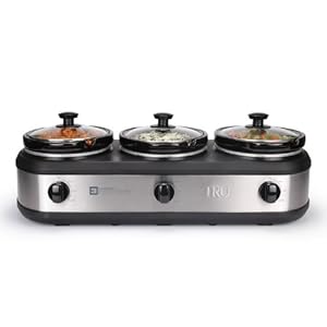 The three 2-1/2-quart stoneware inserts are oval shaped in order to conserve valuable countertop space while offering a total capacity of 7-1/2-quart. The integrated handles on the slow cooker housing further help to save space. Prepare three separate dishes at different temperature levels by using the individual heat controls. Each crock has its own control dial with off, high, low and warm heat settings. The three stoneware vessels lift out of the slow cooker housing for easy clean up. Both the stoneware and tempered glass lids are dishwasher safe.